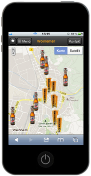 Die Abbildung rechts zeigt den Bierfinder der Woinemer Hausbrauerei. Die Bierflaschen symbolisieren dabei die Märkte in denen das Bier der Brauerei verkauft wird, die Biergläser symbolisieren die Gaststätten. Die Karte wird auf den eigenen Standort zentriert.